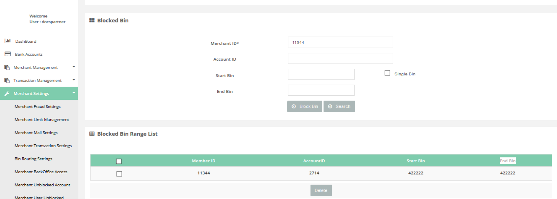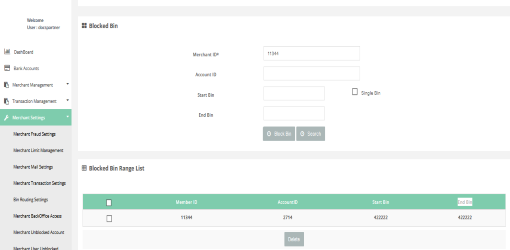 After login you need to click on "Blacklist Details" section under "Merchant Settings" tab in the left navigation panel of Partner's back office. On the resulting page click on "Block Bin" button.
