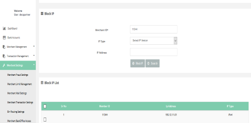 After login you need to click on "Blacklist Details" section under "Merchant Settings" tab in the left navigation panel of Partner's back office. On the resulting page click on Block IP button.