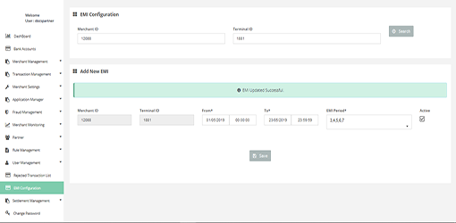 In this page you can see the EMI settings for the partner, which decides whether the EMI options will be available in the checkout page at the time of payment.