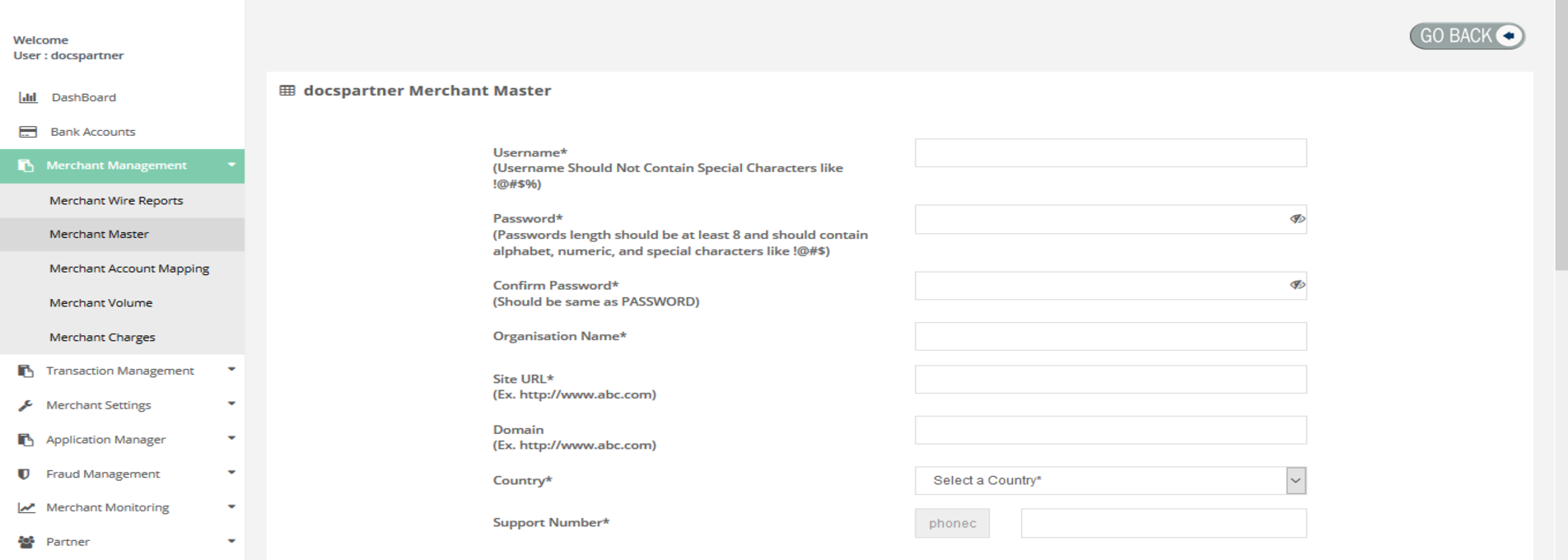 After login you need to click on "Merchant Master" section under "Merchant Management" tab in the left navigation pannel of Partner's back office.
