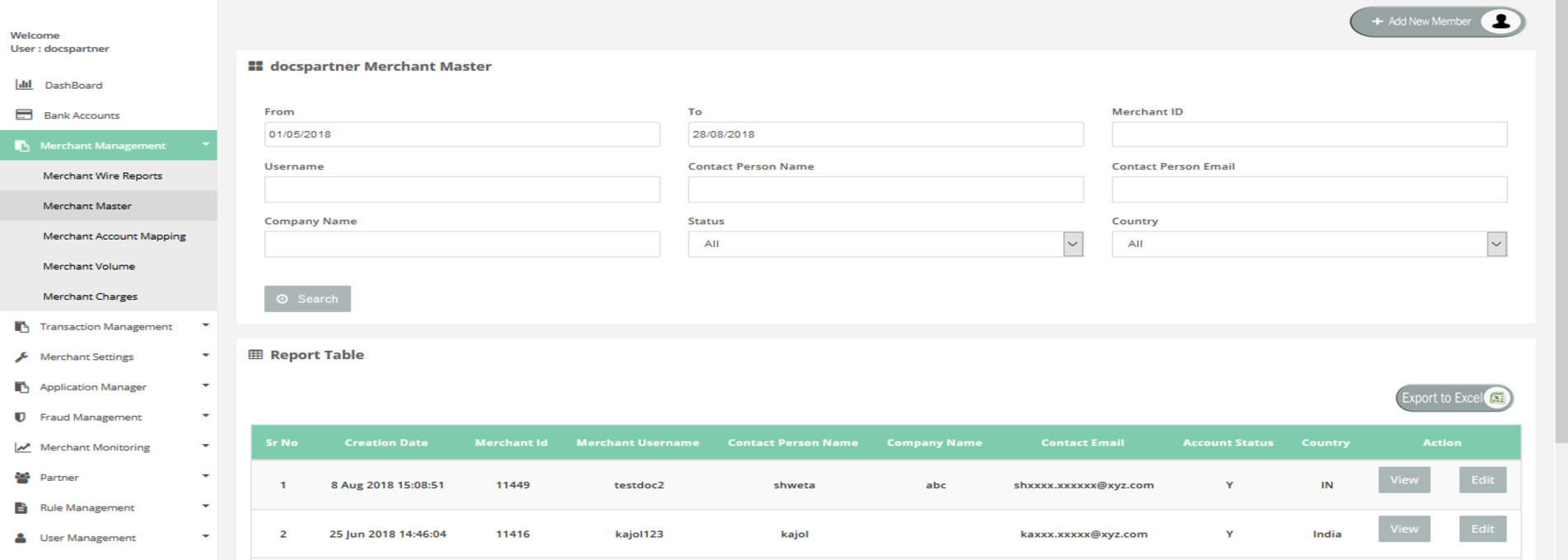 In this page you can add new Merchant and also can view or edit the Member's details.
