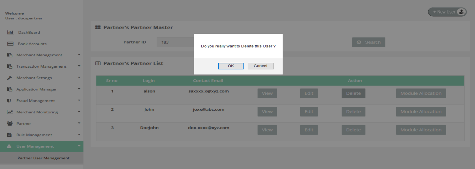 Partner User Management > Delete User