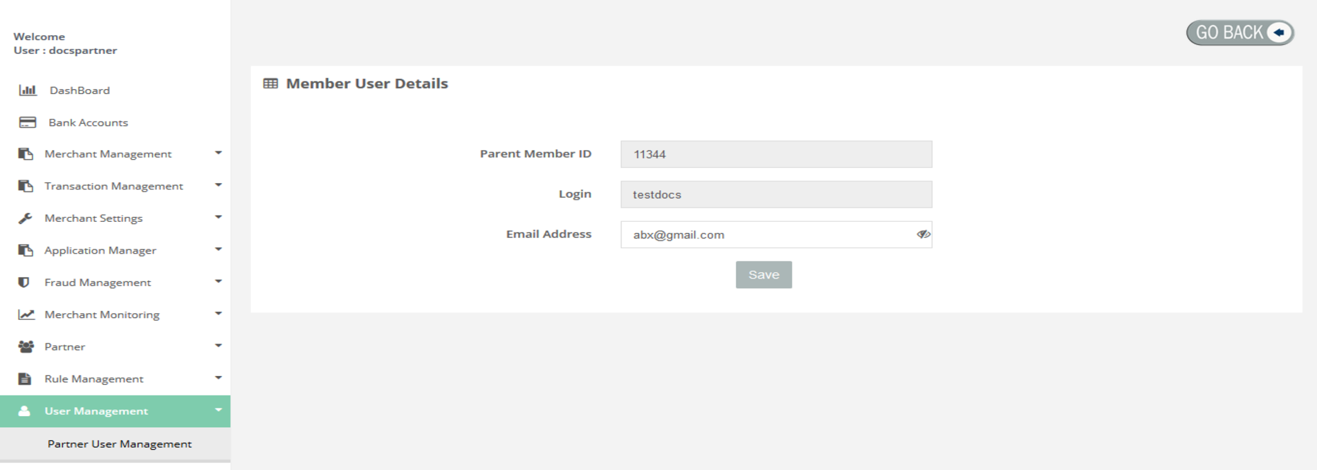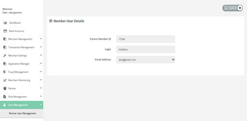 After Login, you need to click on the User Management section in the left navigation panel of Partner's back office. Then you have to click on search to get the list of users which allows you to "View" the user details by clicking on "View" button.
