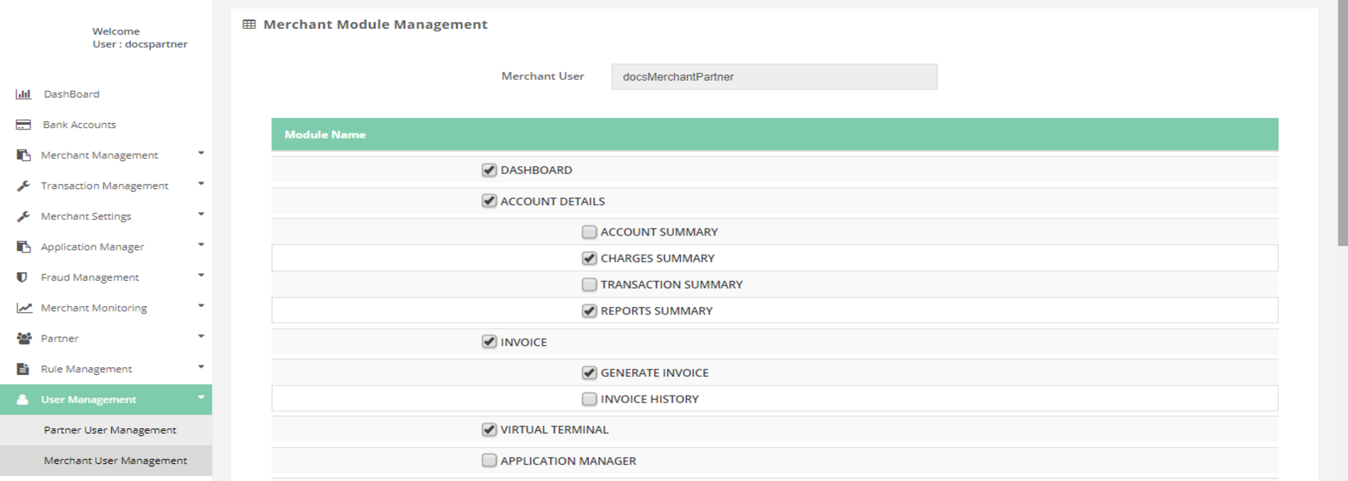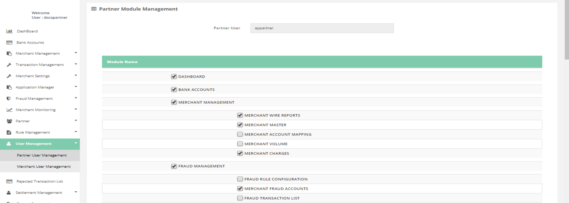 Partner User Management > Module Allocation