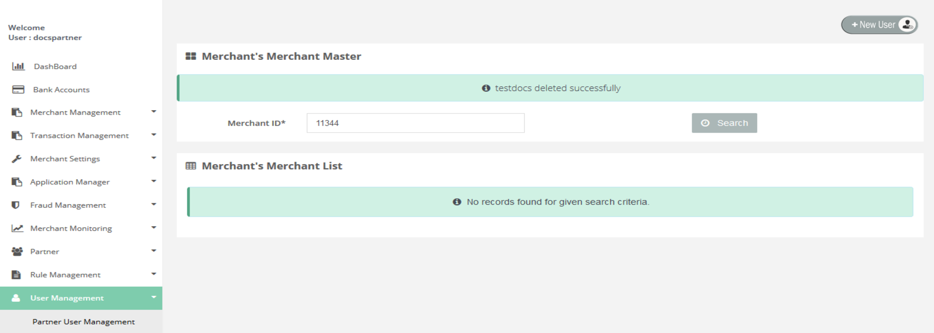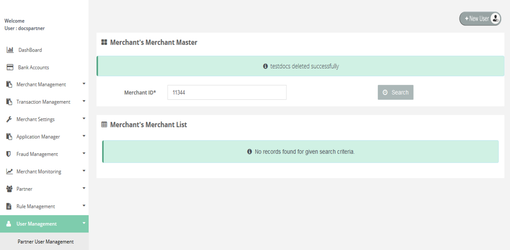 To delete the merchant's details go to the "User Management" section. Then you have to click on search to get the list of users which allows you to "Delete" the user details by clicking on "Delete" button.