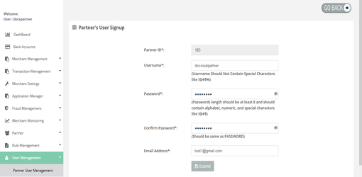 Partner User Management > Add New User
