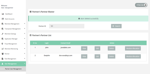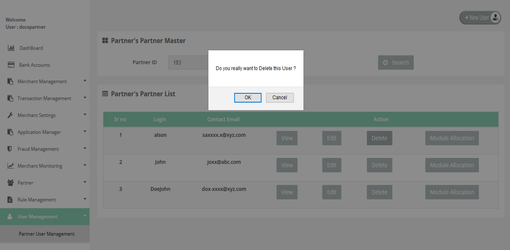 After Login, you need to click on the "Partner User Management" section under "User Management" tab in the left navigation panel of Partner's back office and then you need to click on "Delete" button.