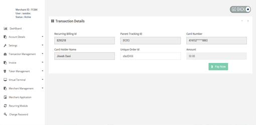 If you want to place an automatic recurring then you need to set frequency and run time or if you want place manual recurring then just give Unique order ID and amount and click on pay now.
